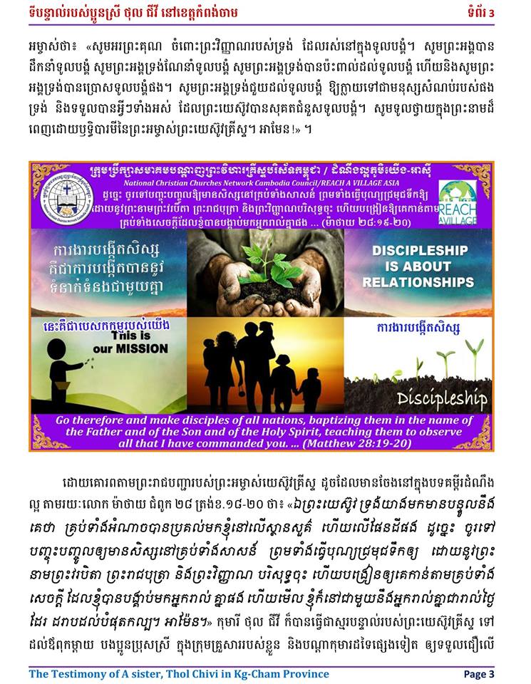 ដោយគោរពតាមព្រះរាជបញ្ជារបស់ព្រះអម្ចាស់យេស៊ូវគ្រីស្ទ ដូចដែលមានចែងនៅក្នុងបទគម្ពីរដំណឹងល្អ តាមរយៈលោក ម៉ាថាយ ជំពូក ២៨ ត្រង់ខ.១៨-២០ ថា៖ «ឯព្រះយេស៊ូវ ទ្រង់យាងមកមានបន្ទូលនឹងគេថា គ្រប់ទាំងអំណាចបានប្រគល់មកខ្ញុំនៅលើស្ថានសួគ៌ ហើយលើផែនដីផង ដូច្នេះ ចូរទៅបញ្ចុះបញ្ចូលឲ្យមានសិស្សនៅគ្រប់ទាំងសាសន៍ ព្រមទាំងធ្វើបុណ្យជ្រមុជទឹកឲ្យ ដោយនូវព្រះនាមព្រះវរបិតា ព្រះរាជបុត្រា និងព្រះវិញ្ញាណ បរិសុទ្ធចុះ ហើយបង្រៀនឲ្យគេកាន់តាមគ្រប់ទាំងសេចក្ដី ដែលខ្ញុំបានបង្គាប់មកអ្នករាល់ គ្នាផង ហើយមើល ខ្ញុំក៏នៅជាមួយនឹងអ្នករាល់គ្នាជារាល់ថ្ងៃដែរ ដរាបដល់បំផុតកល្ប។ អាម៉ែន។» កុមារី ថុល ជីវី ក៏បានធ្វើជាស្មរបន្ទាល់របស់ព្រះយេស៊ូវគ្រីស្ទ ទៅដល់ឪពុកម្ដាយ បងប្អូនប្រុសស្រី ក្នុងក្រុមគ្រួសាររបស់ខ្លួន និងបណ្ដាកុមារដទៃផ្សេងទៀត ឲ្យទទួលជឿលើព្រះអម្ចាស់យេស៊ូវគ្រីស្ទ ដោយទទួលយកព្រះអម្ចាស់ធ្វើជាព្រះអង្គសង្គ្រោះរបស់ខ្លួន ប្រយោជន៍ឲ្យរួចពីបាបនាលោកិយនេះ។ ចាប់ពីពេលនោះមកកុមារី ថុល ជីវី និងក្រុមគ្រួសារ ក៏ដូចជាបណ្ដាគ្រួសារដទៃទៀត ដែលជាអ្នកស្ម័គ្រចិត្តដើរតាមព្រះយេស៊ូវគ្រីស្ទ ទទួលបាននូវសេចក្ដីសុខសាន្ត សុភមង្គល សេចក្ដីអំណរ និងមានភាពចម្រុងចម្រើន ក្នុងព្រះគុណរបស់ព្រះនៃសេចក្ដីសុខសាន្ត។ អាមែន។
