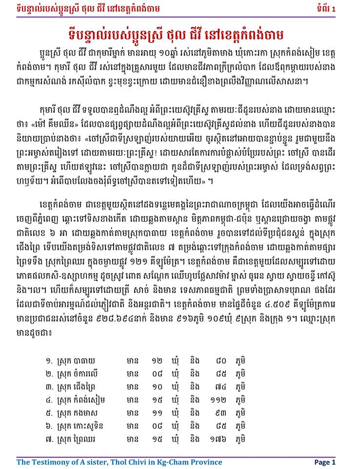 ទីបន្ទាល់របស់ប្អូនស្រី ថុល ជីវី នៅខេត្តកំពង់ចាម